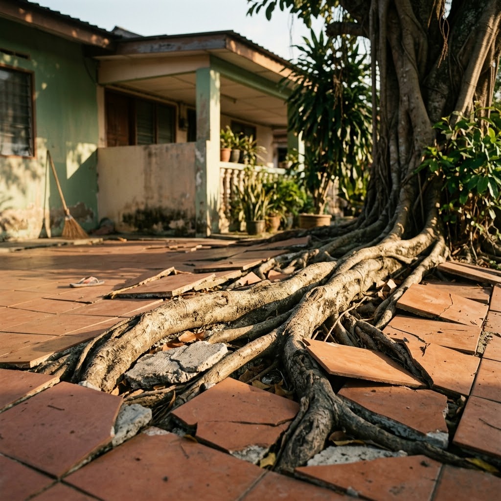 Akar pokok besar mula menjalar dan memecahkan lantai porch rumah.